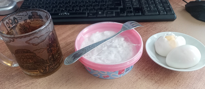 На завтрак сегодня было два варёных яйца и вторая треть банки морского коктейля в майонезном соусе.Плюс чашка чая.