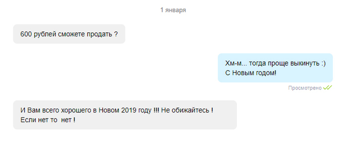 С холодильником отдельная эпопея была. Товар все-таки габаритный, дополнительные проблемы с перевозкой возникли. То один покупатель слезно просит оставить товар за ним, потом вдруг резко пропадает, то другой не может договориться с транспортной компанией… В итоге один адекватный мужик приехал, оставил задаток. А вечером другой пишет (кстати, цена была обозначена в 5000 р.):