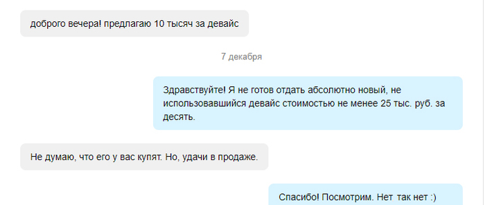 Когда продавали новый игровой роутер, каждый день получали сообщения с попыткой сбить цену в 2-3 раза (как говорится, "Я хотя бы попытался"):