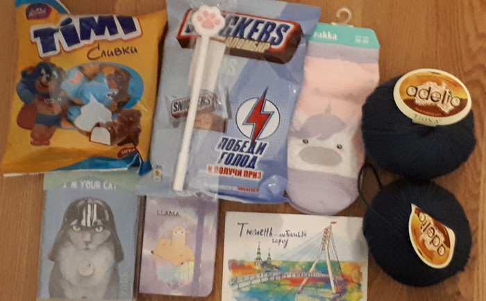 Не будем ходить вдоль, да около. Приступим к вскрытию. А там, все как мы любим : и для ручек ,потворить немного, и радость для глаз, милый блокнот с мимишной ручкой, и вкусовые рецепторы порадовать сластями.