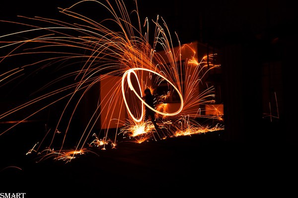 Крутить можно разными способами, и даже придумывать композиции, в мое случае мы пытались создать эффект огненного дождя. Если кому то интересно на заднем плане горит противохимическое средство ИПП-8. Горит бездымно и долго, отлично подходит для фото.