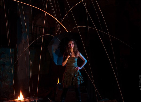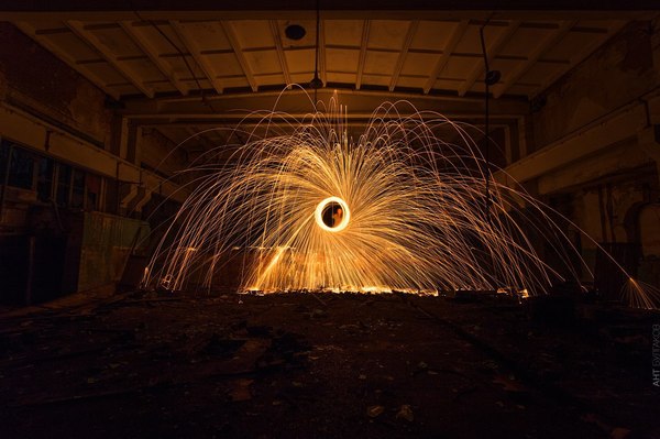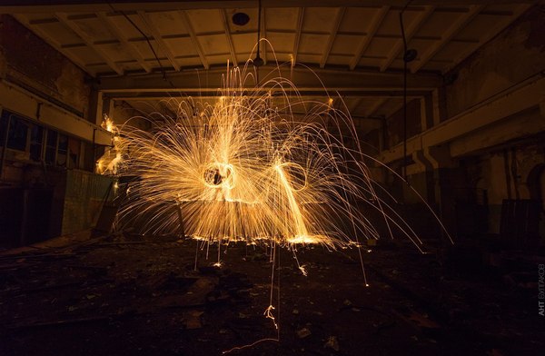 Но так как опыта было мало, количество искр получилось не большим, хотя по задумке, они должны были заливать человека под зонтом. Также на пробу было выдвинуто предложение повыкручивать различные фигуры, типа восьмерки. Сначала было не очень. (На фото для фона использовался заброшенный цех завода)