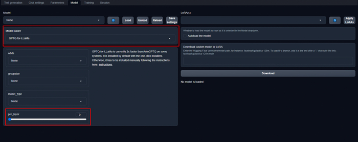 Выбор движка GPTQ-for-LLaMa, и внизу мы можем выделить кол-во слоёв для разделения на CPU/GPU