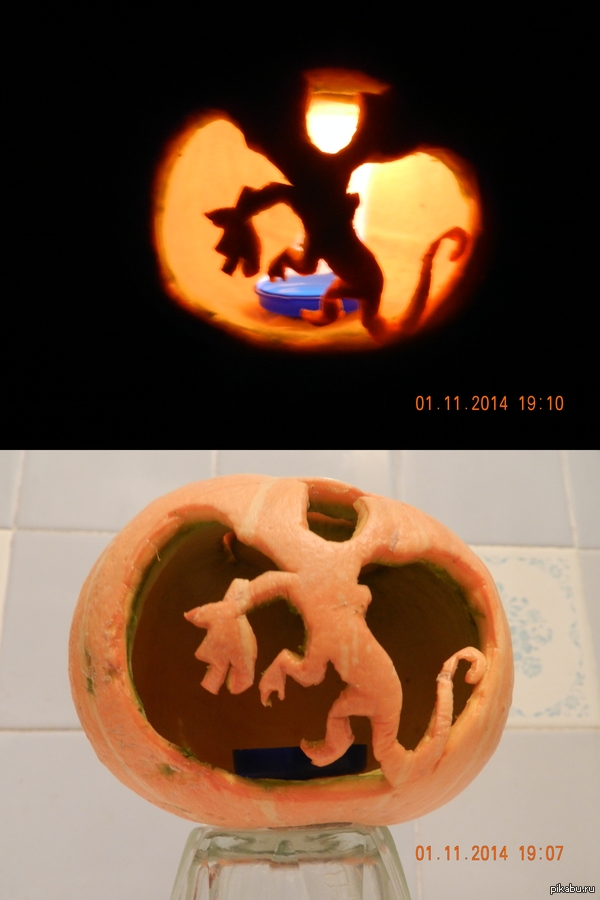 Идею стырил в интернете. Вырезаю из тыкв уже третий год подряд, в 2013 вырезал кошку, а в 2012 классическую страшную рожицу. Фото старых тыкв не сохранились.