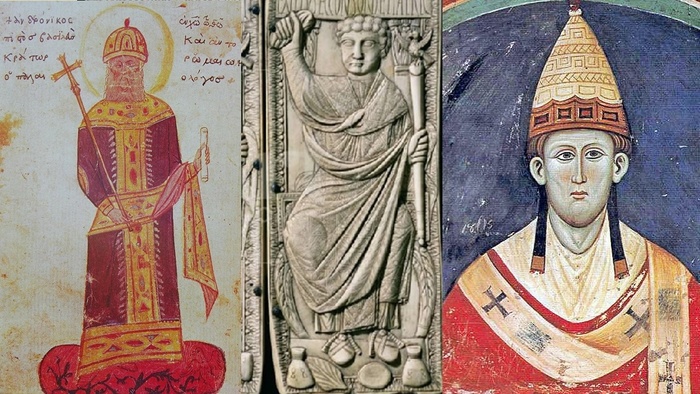 император Андроник II (1282-1328) с лорумом, римский патриций Боэций в трабее и папа Иннокентий III (1198-1216) с паллием