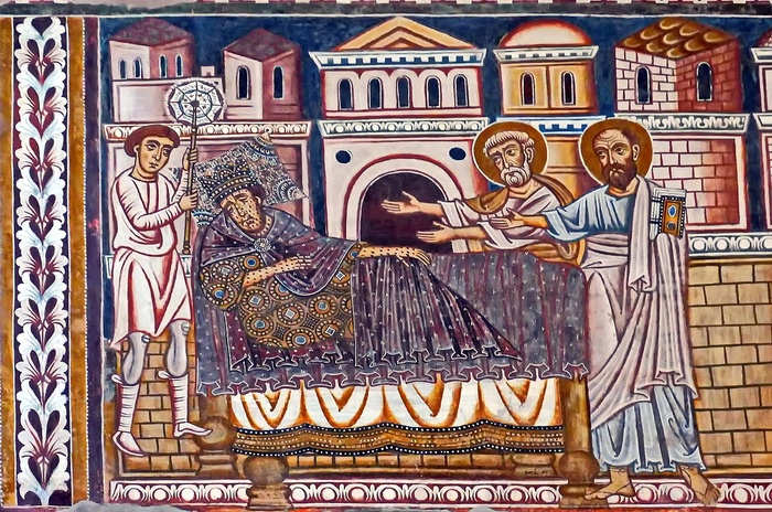 фреска из часовни св. Сильвестра: к императору Константину являются апостолы Петр и Павел, наставляя его на верный путь