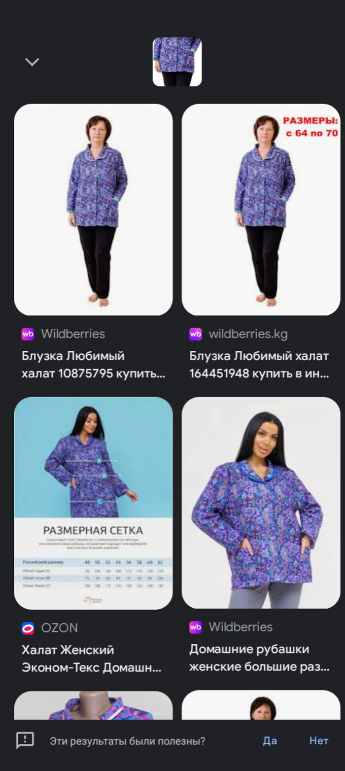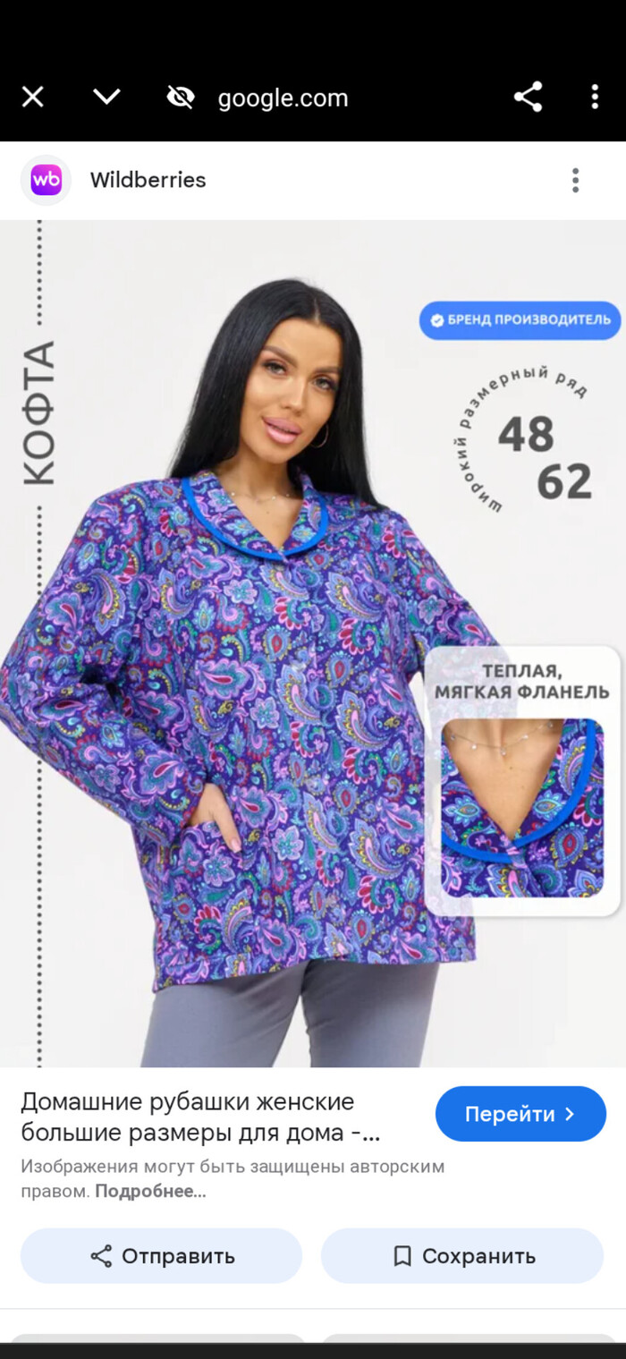 На вб. Но не было размеров больше. А по размерной сетке размер надо было бы покупать 56 или 58, чтобы свободно было. Ведь это фланель. Я два дня искала подобную блузку: и меняла слова в поиске, и жмакала "Похожие", и сортировала по-всякому. И ничего! Вб не выдавал результаты по похожей одежде. Предлагал шлюшьи наряды непривычные, но только не фланелевую кофточку. И тут я вспомнила, что у меня в телефоне есть функция поиск по изображению, оно само ищет. Просто делаю скриншот и вбиваю в поиск