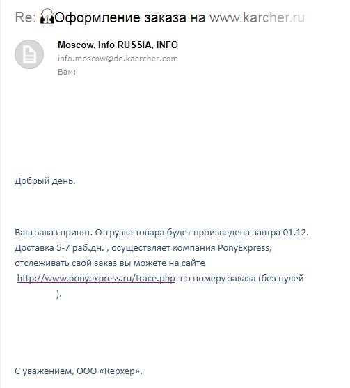 Раза 2 или 3 уже покупал продукцию компании Karcher, но всегда это было в фирменных магазинах и вопросов ни по покупке, ни по обслуживанию не было. Тут решил сделать заказ через интернет-магазин. Условия устроили, доставка в мой город в течение одного рабочего дня да ещё и бесплатная, учитывая сумму покупки. Заказ был сделан в субботу 25.11.2017.