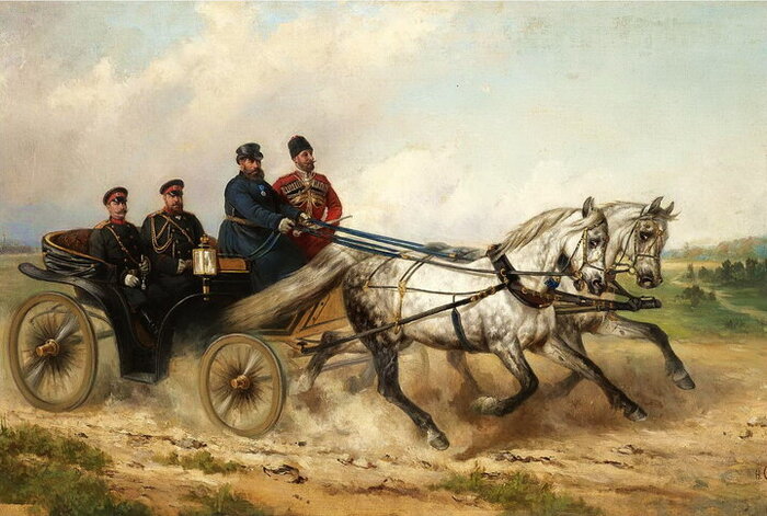 Первое изображение – "Катание в коляске"(Александр II с детьми), Второе – "Александр III в открытом Ландо" художника Николая Сверчкова