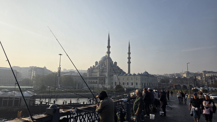 На галатском мосту внизу стоит куча рыбаков. Мост двухъярусный - по второму этажу ходят трамваи и люди, стоят рыбаки, а на первом находится куча рыбных ресторанов. И они конечно все недешевые ни разу.