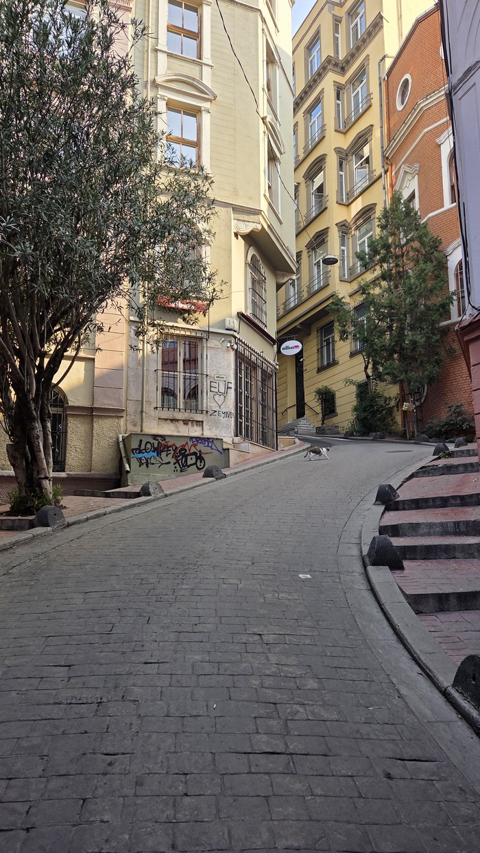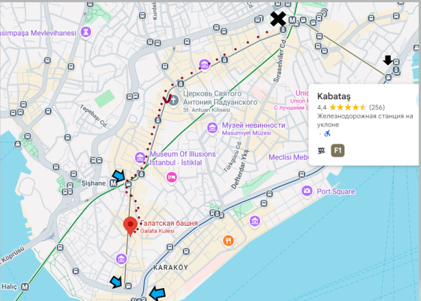 1)Длинная прогулка. Доезжаете на трамвае Т1 до конечной остановки Kabatas (Кабаташ) - черная стрелка, переходите улицу, садитесь на фуникулер до площади Таксим (черный крестик) или приезжаете туда на зеленой ветке метро. После чего неспеша идем по улице Истикляль (смесь Арбата и Тверской), с линией исторического трамвая посередине. Любуемся магазинами или красивыми домами 19 века (кому что), можно заглянуть в католическую церковь Антония Падуанского ( фото будут дальше) Путь отмечен красным пунктиром
