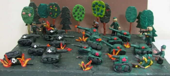 Кстати говоря, именно на этом комбинате в начале 70-х по просьбе скульпторов был разработан специальный вид очень плотного пластилина. В его состав входило намного больше каолина и канифоли, чем в «детские» варианты, а окрас этого пластилина всегда был серовато-зеленым: считалось, что яркие тона отвлекают внимание от формы, что скульптору совершенно ни к чему. Интересно то, что именно из такого пластилина были сделаны эскизы памятника в честь победы на Курской дуге — у скульптора Е. В. Вучетича ушло несколько сот килограммов этого материала.
