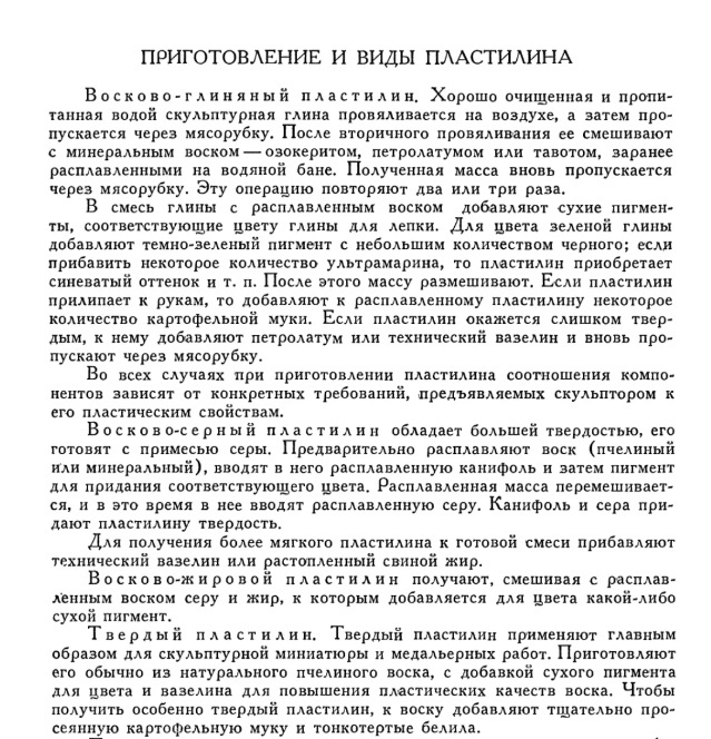 Со временем рецептур такого пластилина стало очень много: каждый скульптор предпочитал делать собственную смесь. Но все их объединяло наличие трех основных компонентов: наполнитель, связующее вещество и пигмент. Любопытно то, что рецепты этих составов дожили и XX столетия: в середине 1960-х гг. издательство «Советский художник» выпустило книгу, где подробно рассказывалось, как своими руками приготовить пластилин под конкретный вид скульптурных работ.
