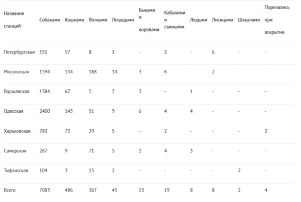 Только собаки заразили бешенством больше 7000 человек. Почему? Да потому что не все укушенные попадали в эти Станции. А в большинстве губерний(их было 59) Пастеровских Станций не было.