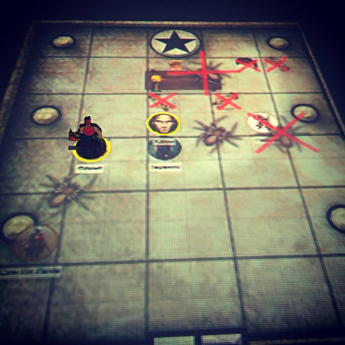 Сейчас мы играем через сайт roll20. А когда встречаемся вживую я транслирую карту через проектор (купленный на небезызвестном сайте подержанных вещей) либо на стол, либо на стену (до этого я пробовал распечатывать карты и делать из картона модульные карты). Да и, ввиду лености, легче за монстров прокидывать дайсы через сайт, хотя кидать настоящие кубы интереснее, не спорю.