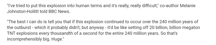 «Лучшее, что я могу сделать, - это сказать вам, что если бы этот взрыв продолжался в течение 240 миллионов лет после вспышки - что, вероятно, не произошло, но в любом случае - это было бы как 20 миллиардов взрывов миллиарда мегатонн взрывчатки каждую тысячную долю секунды все 240 миллионов лет. Так что это непостижимо велико. Огромно ".