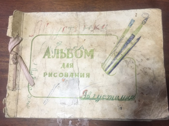 Альбом для рисования перевязанный лентой. Уже весь рваный, потрепанный и изрисованный нами. Для рисования же (хи-хи). Но внутри скрываются 70-е года прошлого столетия.