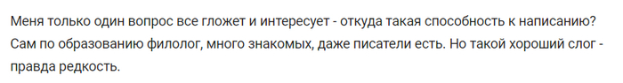 Про книги писала. По поводу каких-то суперспособностей даже не знаю что отвечать.Может быть и правда талант. В шоке вообще что мне тут уже и ВГИК приписали и факультет журналистики. Не знаю что отвечать даже. Спец образования нет, вышку так и не закончила. Стихи в детстве писала, книжки читала, тусила с готами, музыку слушала классическую, после вылезания из жопы много занималась саморазвитием. Думаю что все люди могут так разговаривать - если захотят. Это как дышать - дышишь и не думаешь что кому-то это может быть тяжело, например из-за астмы или ещё чего. Ну и считаю что если хочешь что бы тебя послушали - рассказывай так что бы собеседнику было интересно. Не люблю людей которые просто на уши приседают. Поэтому и прошу писать коменты что-кто-то слушает, интересно и прочее. А то может быть я уже всех заебала и сижу тут со стеной разговариваю. А если кто-то слушает, то это вроде как диалог. Мне нормально говориться и народу приятно слушать. Как-то так.