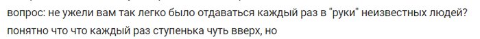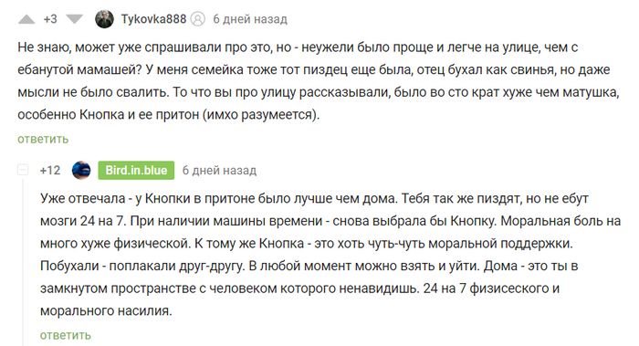 Конечно эта часть моей жизни - концентрированный пиздец, но это как если ходить по стройке без каски - вероятность падения кирпича на макушку на много выше, чем если ходить по городу, и тем более если по полю. Вот и получается если ты бомжара, общаешься с такими же - то такое и происходит. Судьба многих людей в истории много хуже моей и там пиздеца больше, я ещё реально по краю только прошла. Хз что стало с той девочкой из сквота, или с Кнопкой и Янчиком... Там всё страшнее.
