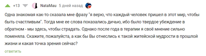 И тогда и сейчас - не думаю что мы приходим что бы страдать или быть счастливыми. Просто мы есть. Уверена - свою судьбу можно изменить, как в плохую сторону, так и в хорошую. Каждый волен сам себе выбирать - кем быть и кем стать. Не факт что сразу получиться стать кем хочешь, но подтянуться - всегда можно. Если у тебя есть моральные силы конечно. А они есть не у всех и не всегда. Надо тянуть самого себя, если можешь - других, но не в ущерб себе. Многие люди ломаются. Такова жизнь. Всем не поможешь.