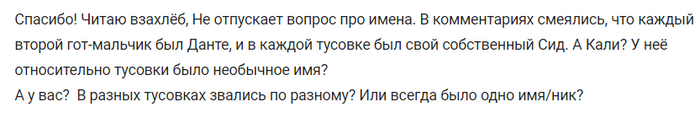 Кали - богиня смерти. У неё простое готическое погоняло. У меня на всех тусовках сменилось по погонялу. С Сидом было одно, Ром меня звал по имени и я там не особо была вхожа в тусовку, только с ним ходила, на черте мне привязали погоняло по внешности, Мерлин мне привязала ещё одно погоняло - готишное.