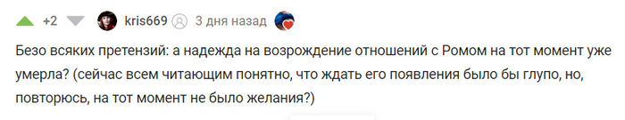 Я же из-за него чуть не вскрылась. Вообще до последнего надеялась что он что-то придумает. До сих пор пиздец как сожалею о его судьбе. Я бы наверное тогда почку отдала и левую руку - если бы знала, что это его спасёт.