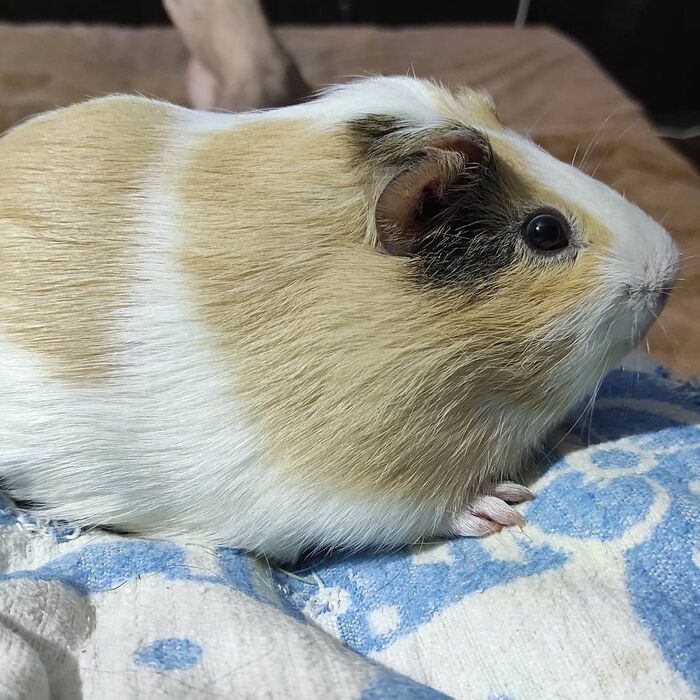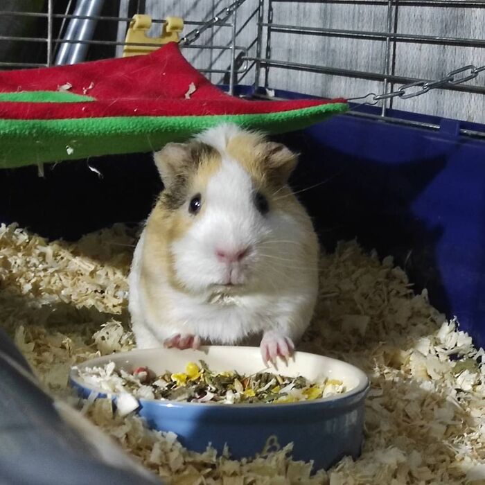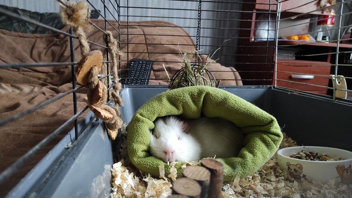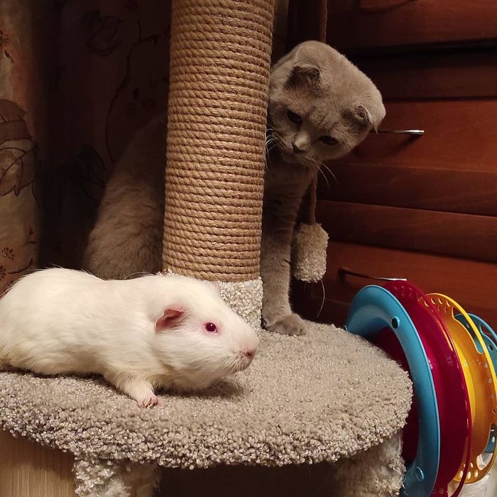 Параллельно им ещё заприметил в зоомагазине, где закупал для них всё, свинку- альбиноса, очень страшную, она прямо выросла у меня на глазах с мелкого головастика до уже взрослой особи, а никто не покупал его :(((
