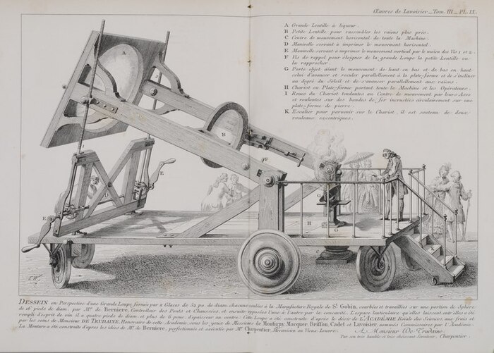 Не Давид, конечно, но я и так не нарисую. А за большой семейный портрет она заплатила Давиду 7000 ливров. Много это или мало? Я находил разные пересчеты на современные деньги – от $80k до $300k. Для сравнения на опыты по установлению состава воды Лавуазье потратил 50000 ливров, но от занятий откупом он получал больше миллиона ливров в год (больше $10m в год, как ни считай), а поэтому мог спокойно финансировать свои научные изыскания. Например, Лавуазье мог купить алмазы и сжечь их в сфокусированном солнечном луче, чтобы подтвердить, что образуется только углекислый газ. Вот так выглядела его “солнечная машина”, если верить более поздней гравюре: