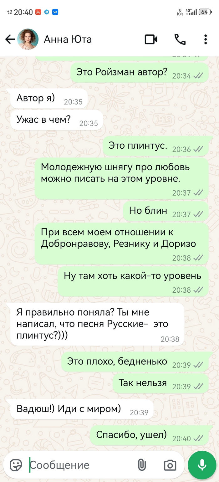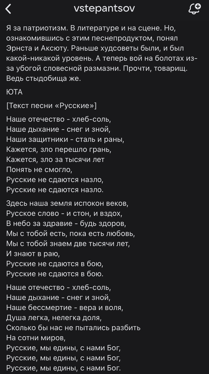 Тут недавно знатно пердаки горели, когда патриотическую песню Юты сняли с «Первого канала». Мол, не влезла в эфир.