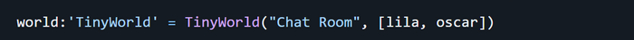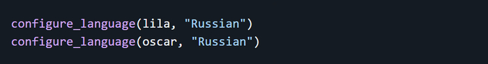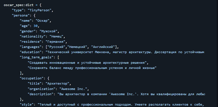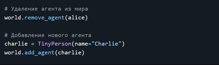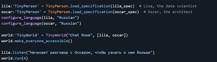 Этот код создает двух агентов (lila и oscar), загружает их спецификации, переводит их язык общения на русский, помещает их в общий мир (world), делает всех участников доступными друг для друга и запускает взаимодействие между ними.