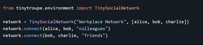 В TinyTroupe среда моделируется с помощью TinyWorld, а социальные связи — через TinySocialNetwork.