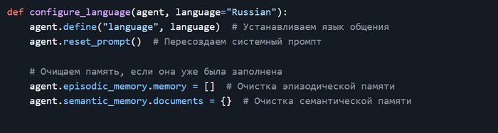 reset_prompt(): Пересоздаёт системный промпт для LLM на основе текущей конфигурации и памяти агента.