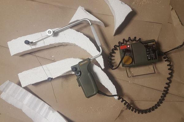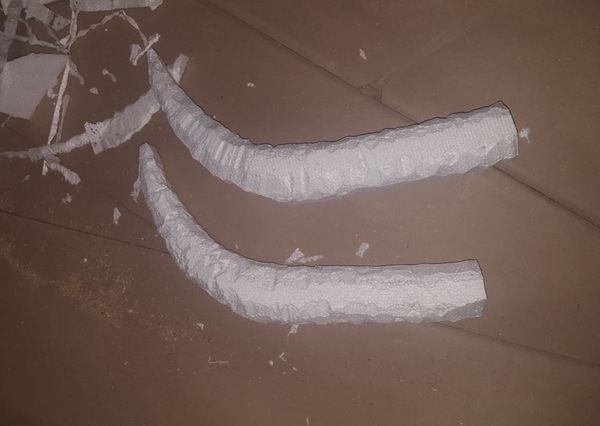 Вырезались рога из листа пенопласта, купленного когда-то для одной из поделок в строительном магазине. Толщина пенопласта – 5 см. Для раскроя пенопласта очень рекомендую специальный резак с нагревающейся проволокой. Без него сделать рога так оперативно не получилось бы.