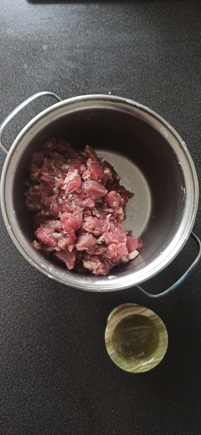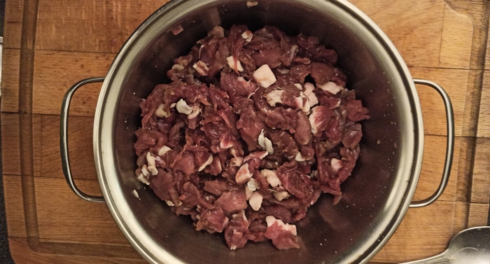 Итак, процесс. Очищаем телятину от жил. И нарезаем. Я резал на маленькие кусочки, можно и покрупнее.