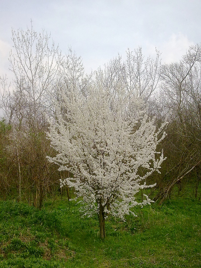 Вчера гулял за городом, встретил в лесу такую гостью. Непонятно, как она туда попала, я не ботаник, но похоже на молодую вишню. Запах чувствуется метров за 10, аромат такой - будто перед носом бочка с мёдом. Пчёл целый рой вокруг.