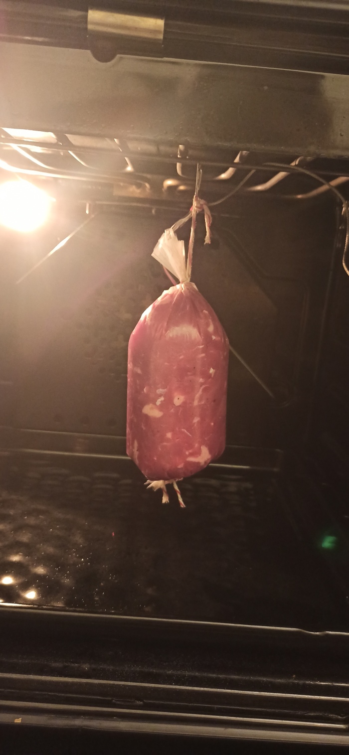 После этого набил фаршем полиамидную оболочку и повесил в комнате.