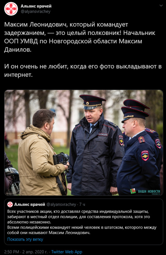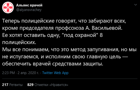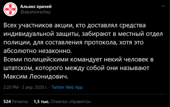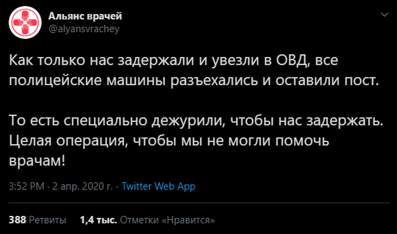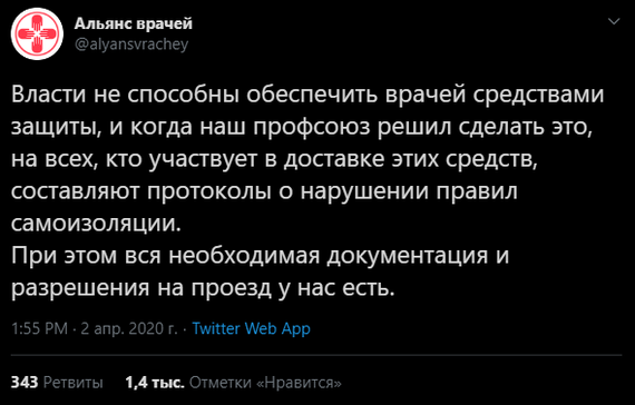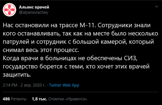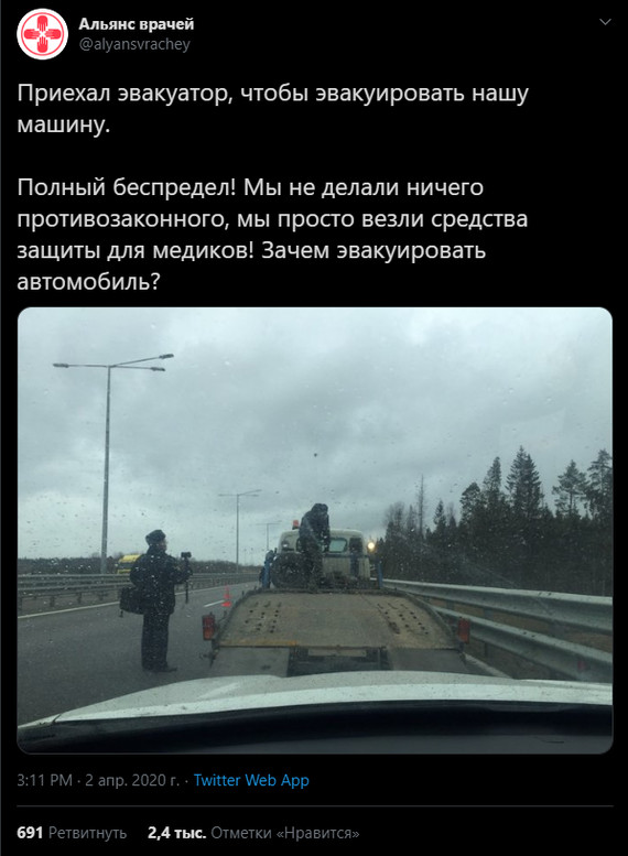 В Новгородской области сотрудники полиции остановили автоколонну профсоюза "Альянса врачей" и задержали активистов, которые везли средства индивидуальной защиты для местных медработников. Об этом сообщается в твиттере профсоюза.