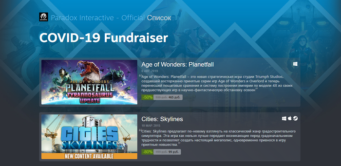 В Steam началась распродажа игр компании Paradox Interactive. Одиннадцать проектов получили скидки вплоть до 80%. Продлится акция до 3 апреля 20.00 по МСК. Издательство заявило, что деньги от распродажи пойдут в фонд помощи по борьбе с COVID-19, организованный Всемирной Организацией Здравоохранения.