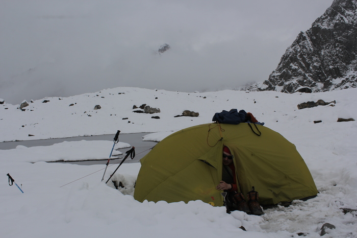 На перевале оставили записку и пошли вниз - к далёкому полузамерзшему озеру внизу.