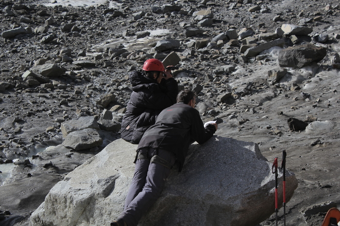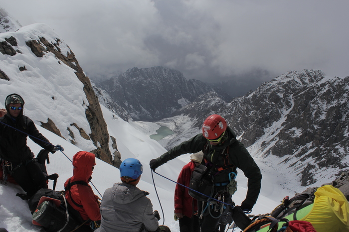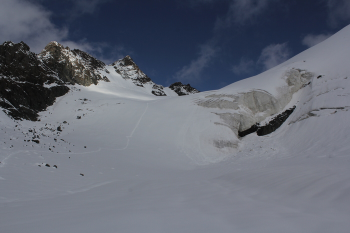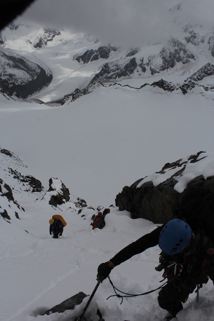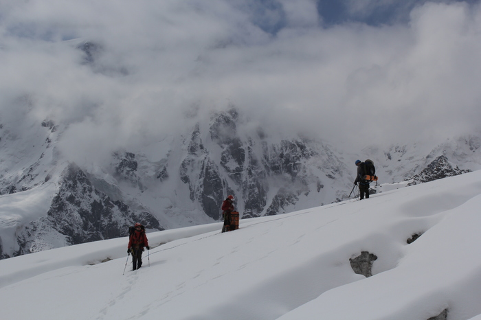 Идем вниз по веревкам, а потом, в связках, по леднику. Снова приходят облака. Ира, инструктор, говорит: где-то впереди ледопад, нам нужно обойти его правее, но не очень правее. Кто пойдет? Связки молчат, друг - друга еле видно в начавшемся снегопаде. А это-ледник и где-то рядом - огромный обрыв, а надо идти. Страшно. Молчим. Ира ворчит и отправляет свою связку первой, идем по их следам - немного стыдно. Внизу ненадолго распогаживается - смотрим вверх - да, там ледопад, но все кроме него покрыто мягким снежком, можно было бы спокойно спуститься..