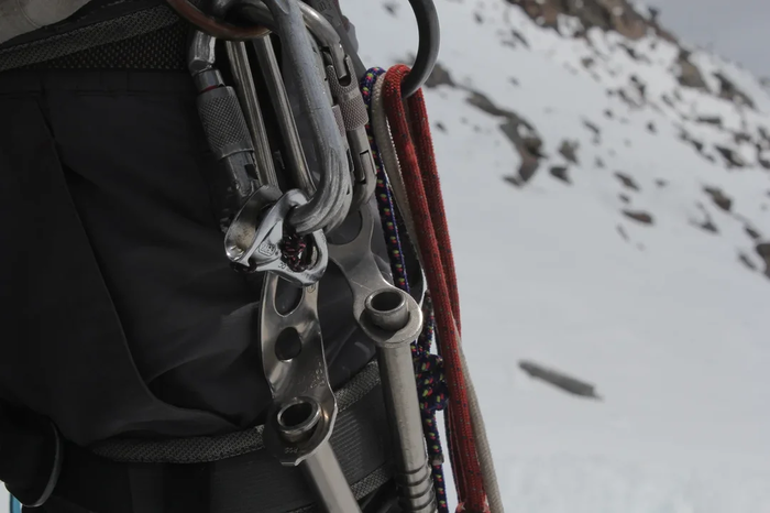 Упаковываемся в альпсистемы, толсто шутим на тему теплых уютных квартир. Стоим по бедра в сугробе, протаптываем себе яму, чтобы не прикасаться к снегу пока связываемся в связки. Холодно.