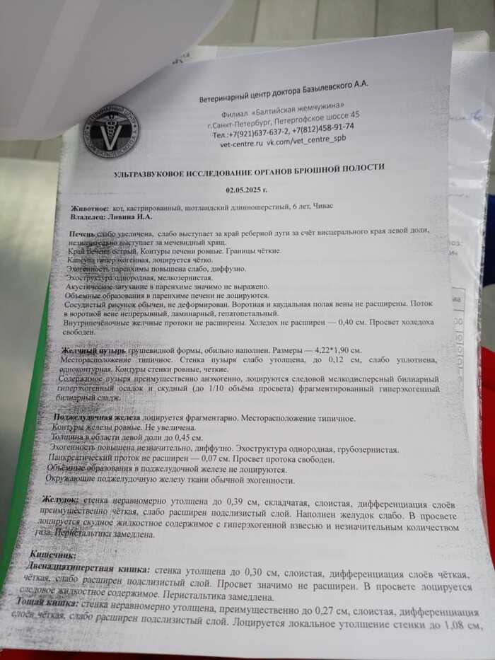Здравствуйте любимое и уважаемые сообщество! Читаю давно, но зарегался сегодня ибо не знаю совсем что делать. Счастливый обладатель замечательного котика по имени Чивас (не сложно догадаться, шотландец). 3 ддн назад заметил что миска с едой не тронута. Вчера утром котик был необычно вялым. Решил не тянуть и сразу поехал в ветеринарку. Опыта с с врачами данной категории не много, а который был оказался тупой развод на деньги, т. е. печальный. Но к сожалению альтернативы нет. И знакомых кто что-то может посоветовать нет. Поэтому пишу сюда с просьбой о помощи советом! Взяли кровь, врач сказал что анализы в норме, но нащупал новообразование в брюхе. Отправил на УЗИ. Сегодня УЗИ выявил ноопластому тонкого кишечника и кучу всякого ещё.. Врач взглянув на заключение развёл руками и сказал искать онколога и что либо советовать не может и прогнозы давать не может то-же. Не знаю совсем что делать.. Понимаю что нарваться с таким диагнозом на очередной развод, проще простого. А деньгами к сожалению сейчас совсем не располагаю и финансово не готов к большим тратам на возможно бесполезные процедуры и лечение.. Жду ссоветов или может у кого был опыт по спасению кота с таким диагнозом? Всем ооткликнувшимся, заранее большое и человеческое спасибо! заключение УЗИ и крови анализ прилагаю..