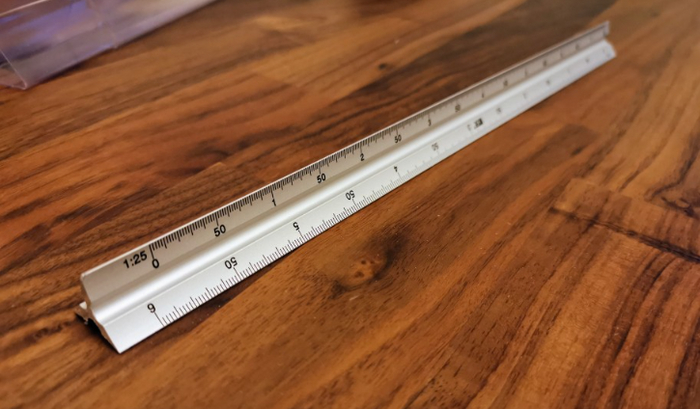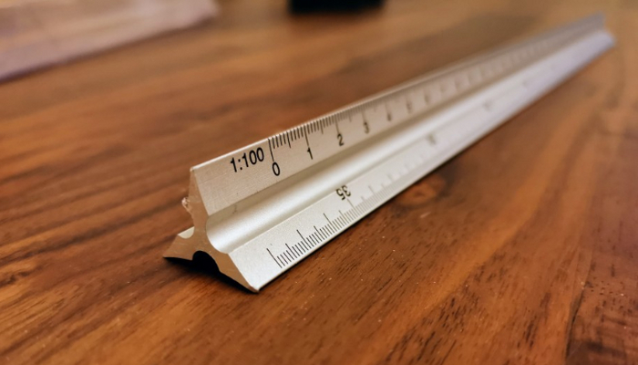 Измерительный инструмент с шестью гранями, каждая из которых имеет линейную разметку в масштабах 1:50 ~ 1:75; 1:20 ~ 1:25 и 1:125 ~ 1:100. Длина линейки составляет около 30 см/11,8", что делает ее компактной и удобной в использовании.