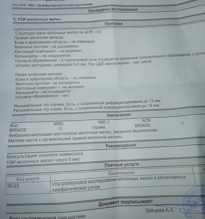 Решили, что ждать бесплатную консультацию смысла нет, как и надеяться на понимание вусмерть заебанного доктора (доктора не осуждаю, только сочувствую). И поехала в гос клинику в Москву, которая оказывает и платные услуги. Там врач онколог-маммолог долго делала УЗИ, пытаясь найти то, что указано в предыдущем. Но увы (или ура) так ничего и не обнаружила, кроме кисты.