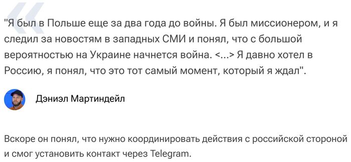 "Мне нужно было понять, где находится линия фронта, где располагаются российские солдаты. Я стал отслеживать это по новостям, смотрел различные Telegram-каналы. Я нашел канал, который относился к подразделению территориальной обороны ДНР, там был бот. Контакты с российской стороной я поддерживал преимущественно через Telegram. Я получал сообщения через этот бот", — рассказал американец.