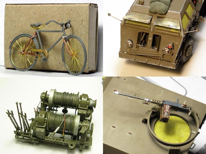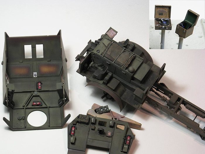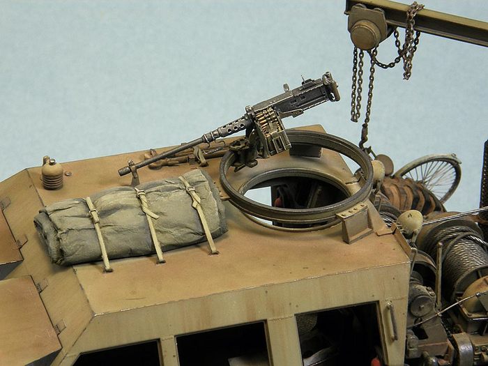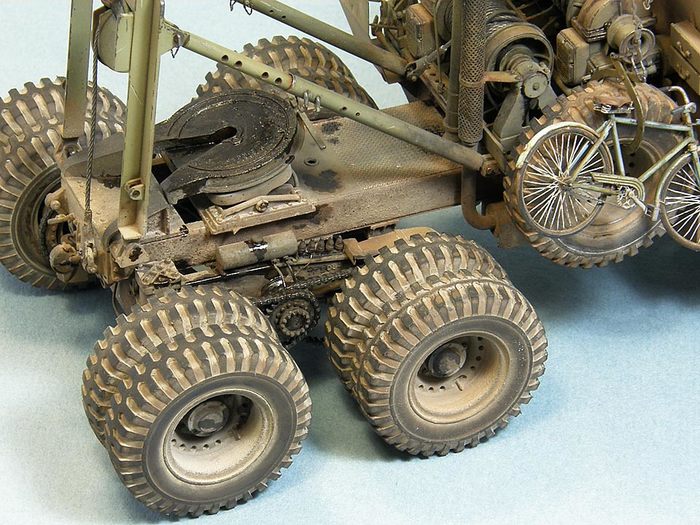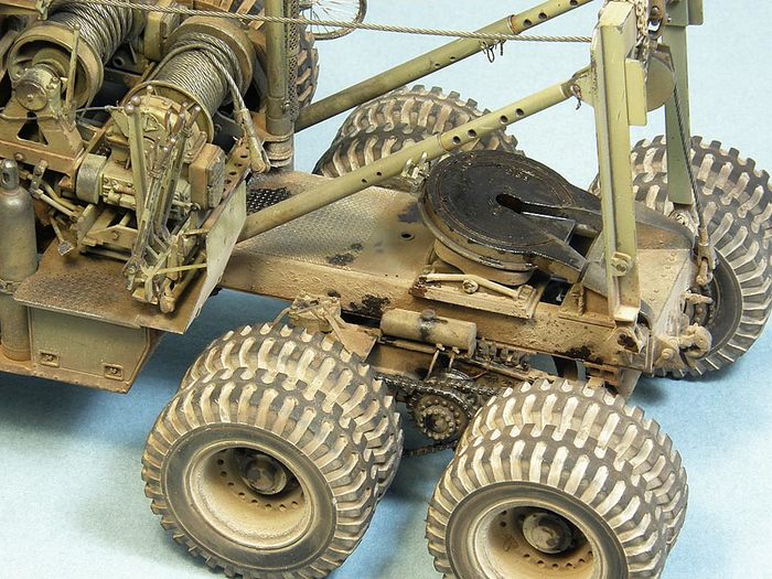 Окраска производилась красками «Model master» и Звезда. Декали использованы только для таблички на лебедке; все звезды, буквы и цифры задуты через трафареты или нарисованы от руки. Для фильтров и смывки применял художественное масло на Тиккуриле, с промежуточной задувкой мебельным нитролаком. Тонировка – худ. масло, темпера, пигменты MIG, пастель, графит. Потеки масла и солидол – глянцевый акриловый лак Tamiya + пигменты.
