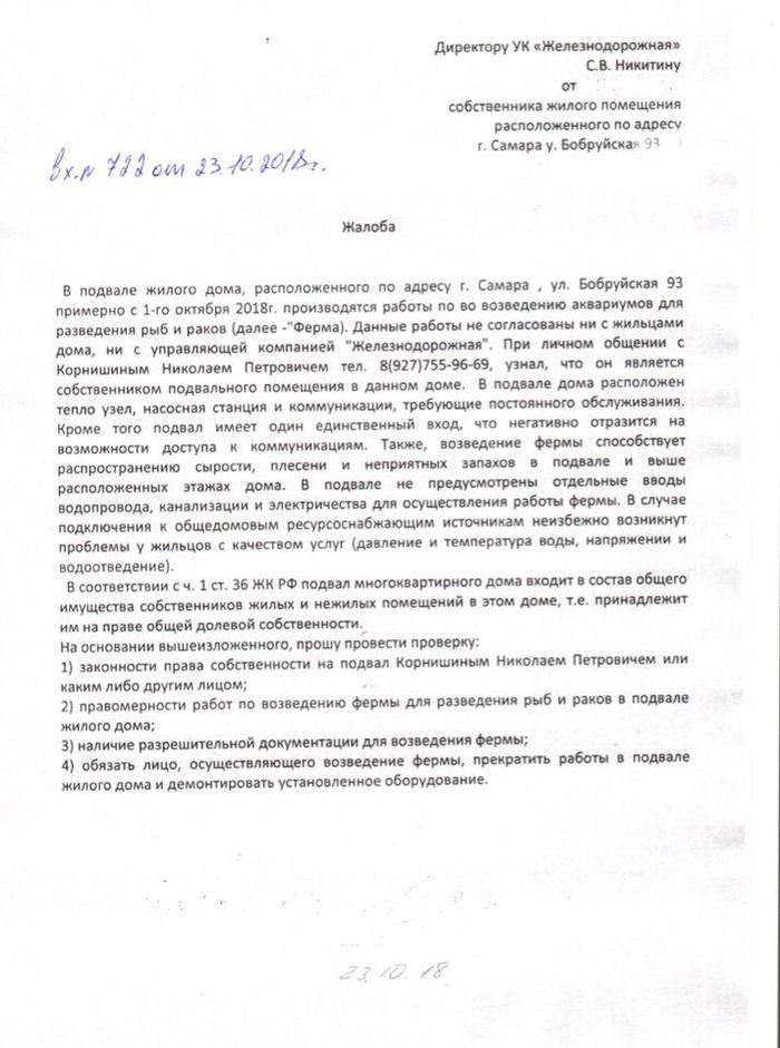 В подвале многоквартирного жилого дома по адресу г. Самара, ул. Бобруйская, д. 93, являющимся общедомовым имуществом некто ИП Корнишин Николай Петрович, не имея предусмотренного ЖК РФ согласия 100% собственников жилых и нежилых помещений в многоквартирном жилом доме производит обустройство аквариумов для разведения рыбы и раков (далее – ферма). При запуске фермы в работу неизбежно повышение уровня влажности на жилых этажах, возникновение сырости, плесени и грибковых отложений. В случае подключения к общедомовым ресурсоснабжающим источникам ухудшится качество поставляемых РСО услуг, таких как температура и давление воды, напряжение в электросети. Администрация и Прокуратура Советского р-на, ГЖИ занимается бюрократической перепиской, никаких мер по приостановке деятельности фермы, демонтажу оборудования и установления законности приобретения ИП Корнишин Николай Петрович общедомового имущества не предпринимается.