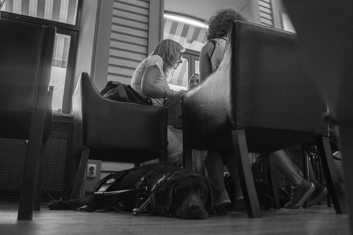 Так вот, Надежда не такая. Она никогда не сует никому в нос свою инвалидность. Сталкиваясь с непониманием она снова и снова терпеливо объясняет ситуацию. У нее за год было минимум две ситуации, когда можно было раскатать в суде крупные компании, опозорить, отсудить компенсацию... а она просто поговорила. И перед ней извинились... За год она без скандалов, требований и пикетов рассказала миллионному городу о том, как живут собаки-проводники и их подопечные. И город стал немного приветливее.