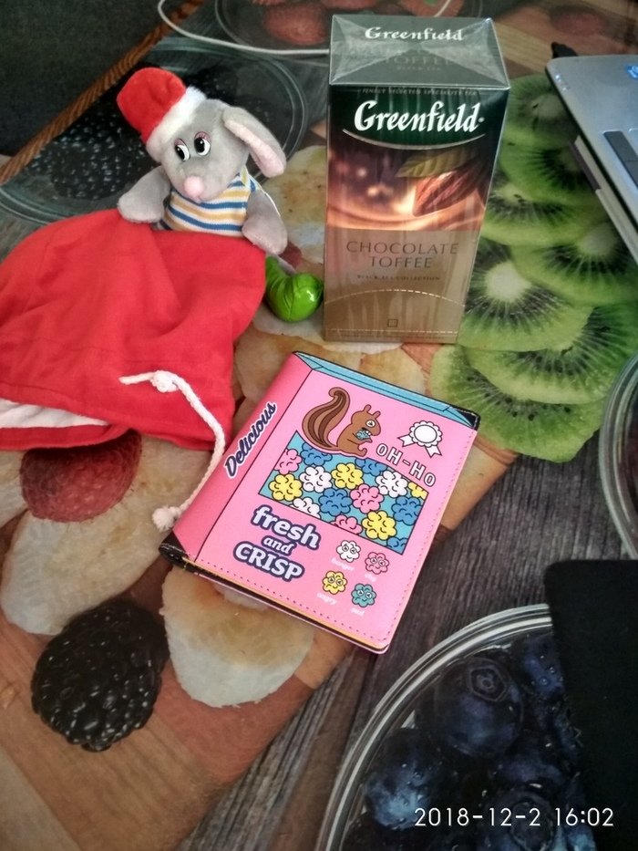 Это еще не все)) в мешочке с мышкой был чай, ни разу не пила шоколадный гринфилд, обязательно попробую, обложка-визитница очень кстати- в моей визитнице закончилось место)