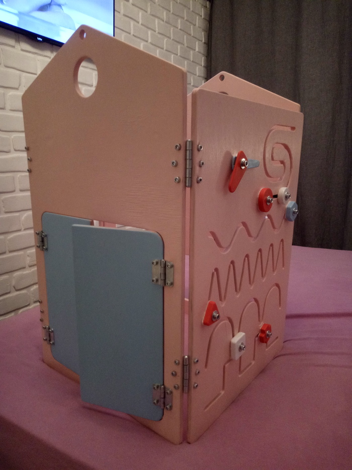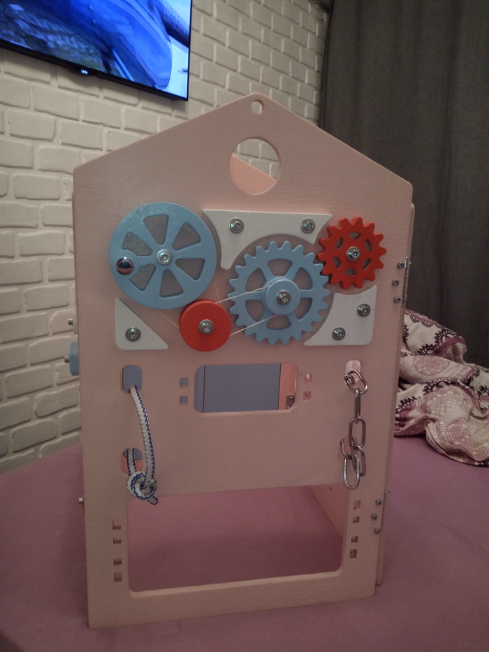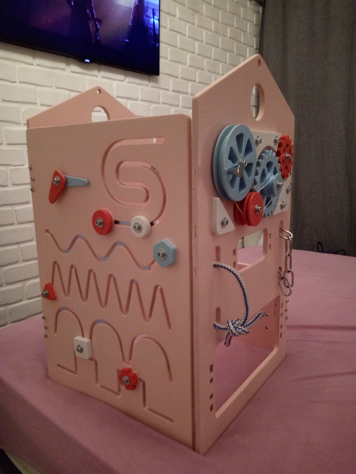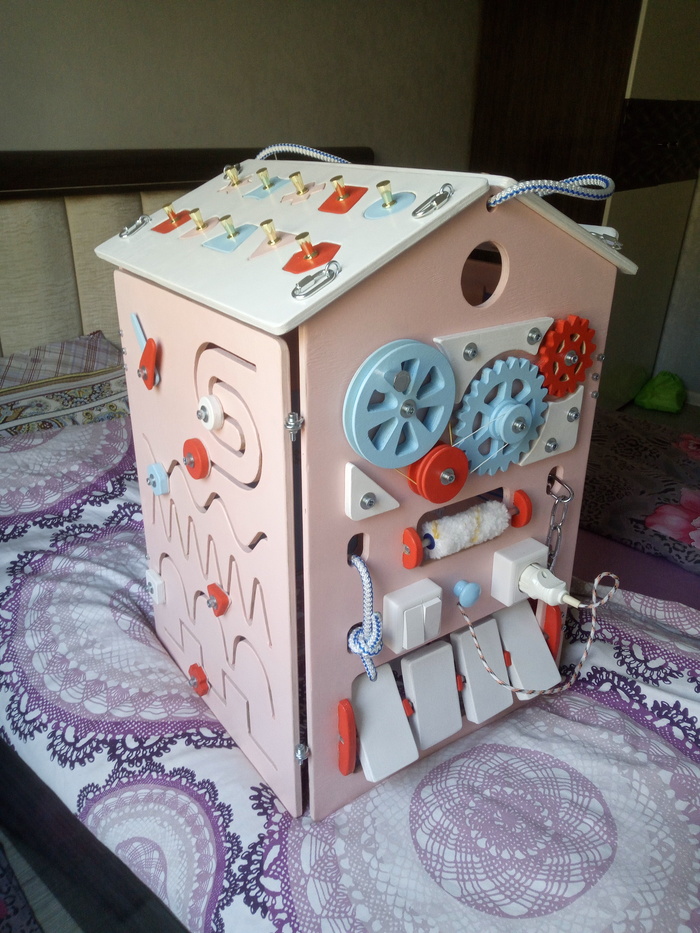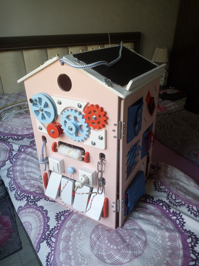 Ребёнку было 9-10 месяцев и я подумал, что надо бы приобрести ей бизиборд, чтобы мелкую моторику развивала и всякое такое. Начал гуглить, чтобы посмотреть, какие они вообще бывают. Хотелось что-то необычное, красивое и крутое )) В гугл картинках я наткнулся на вариант, в который сразу же влюбился. Это был БизиДом от одной компании из Питера (кажется). Зайдя на их сайт и ознакомившись с расценками, я немного прифигел. Домик на который пал мой выбор стоил там на тот момент около 15к. Типа такого: